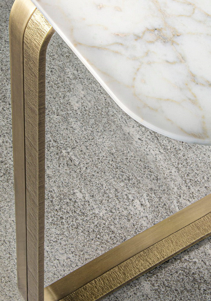 طاولة سطحها رخام ايطالي طبيعي ابيض مع اوردة رمادية القاعدة رخامية بنفس التصميم مقسمة لثلاث اقسام مستطيلة ارجل الطاولة من الستانلس ستيل المقاوم للصدأ مطلية باللون النحاسي الذهبي الانيق