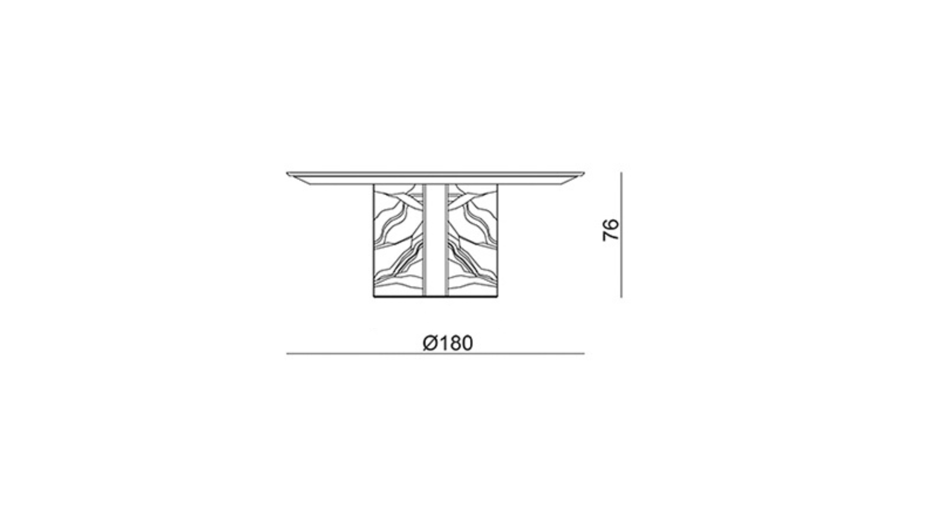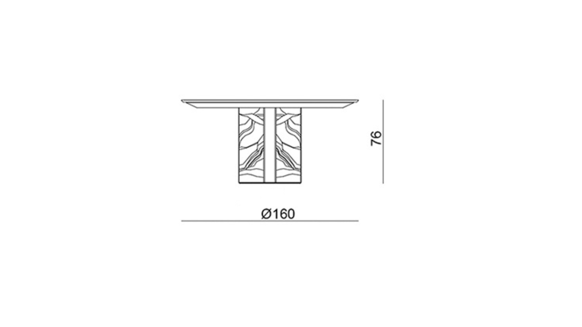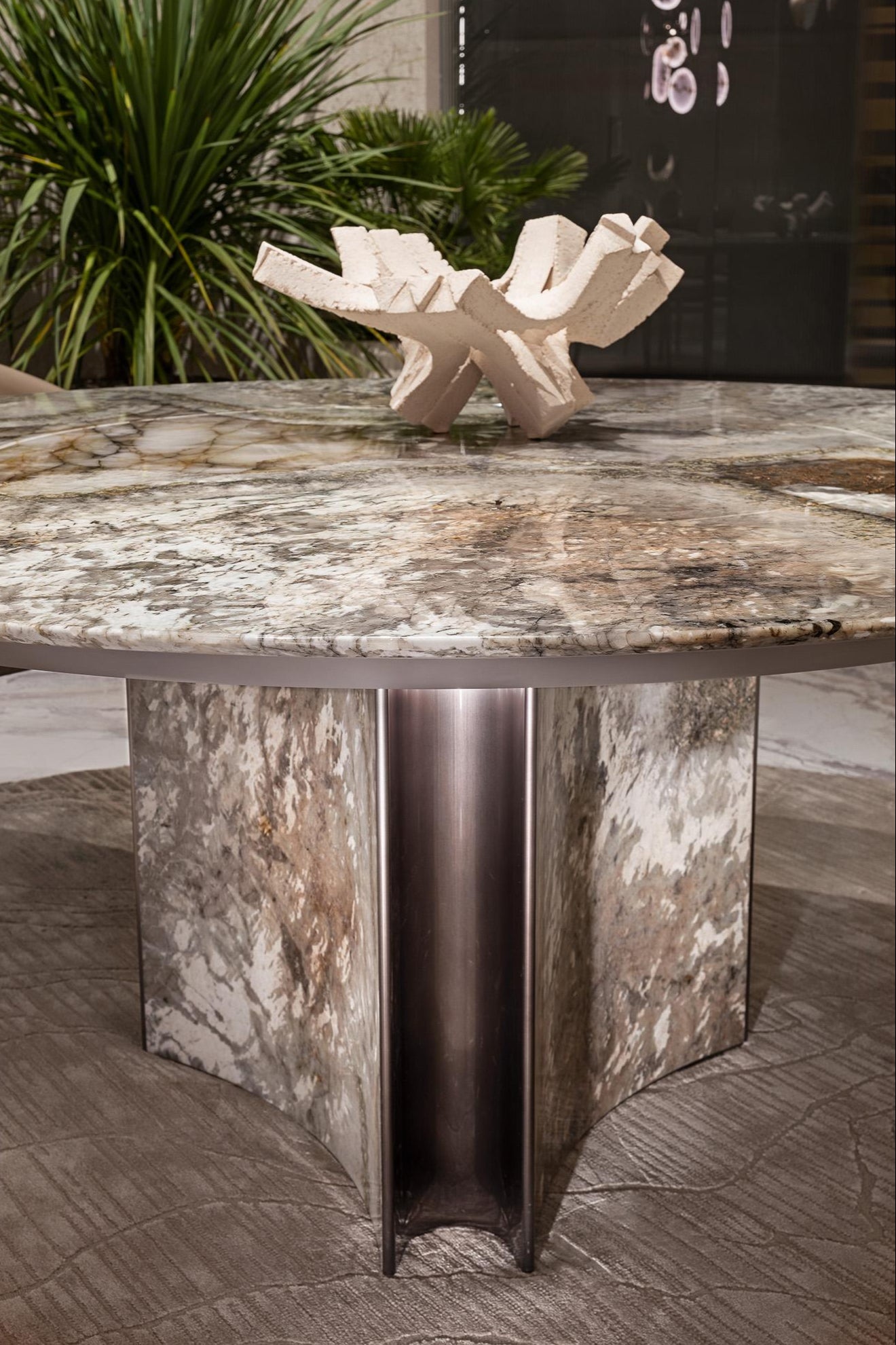 طاولة دائرية مصنوعة بالكامل من الرخام الإيطالي الطبيعي بنمط متداخل غني بالتفاصيل اللونية مع حواف مدوّرة بدقة عالية القاعدة أسطوانية الشكل مدعّمة بعناصر معدنية داخلية لتعزيز الثبات والمتانة تتكوّن من أربعة ألواح رخامية متقاطعة من الستانلس ستيل المقاوم لصدا بلون النحاس البني الذهبي