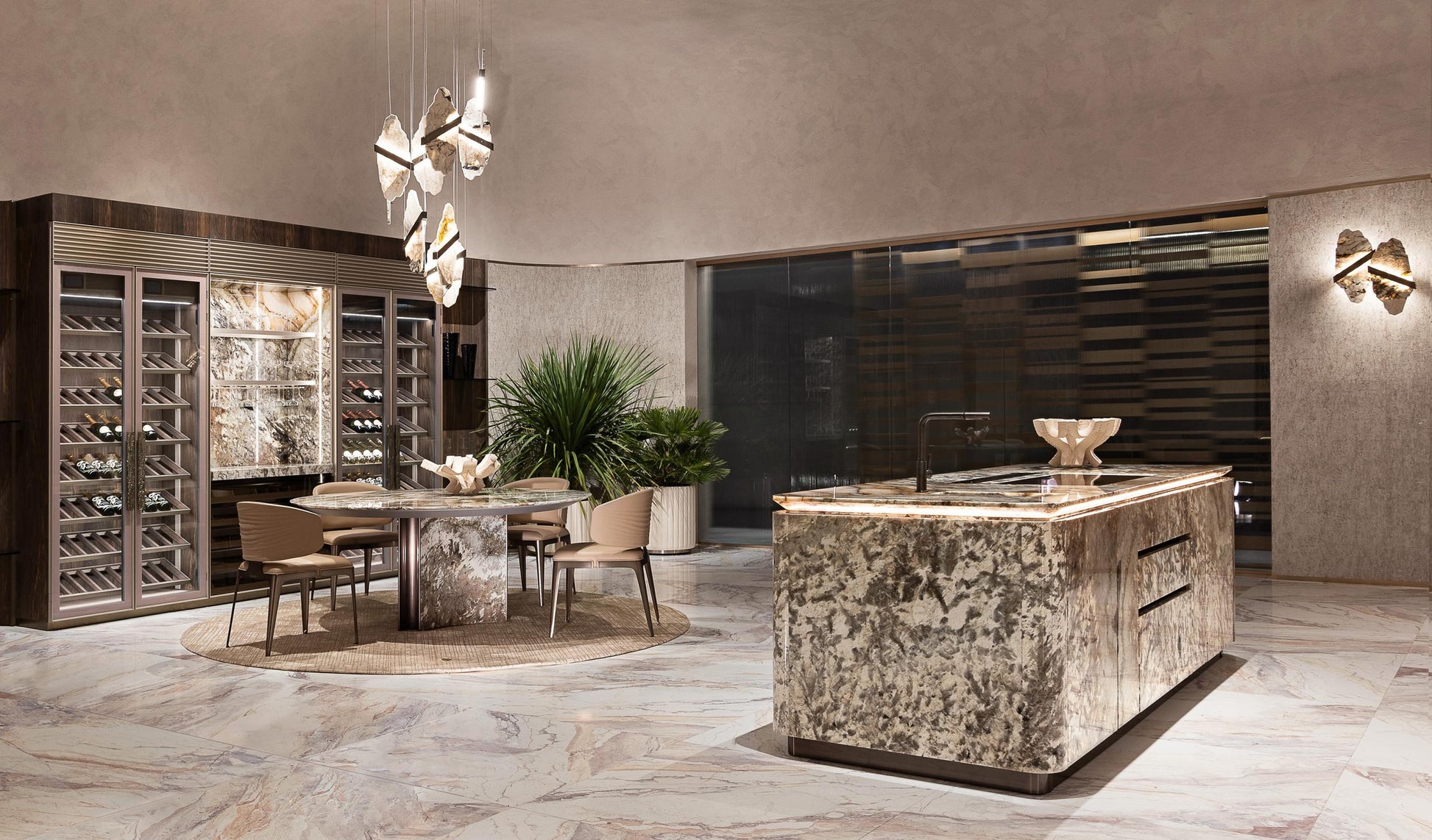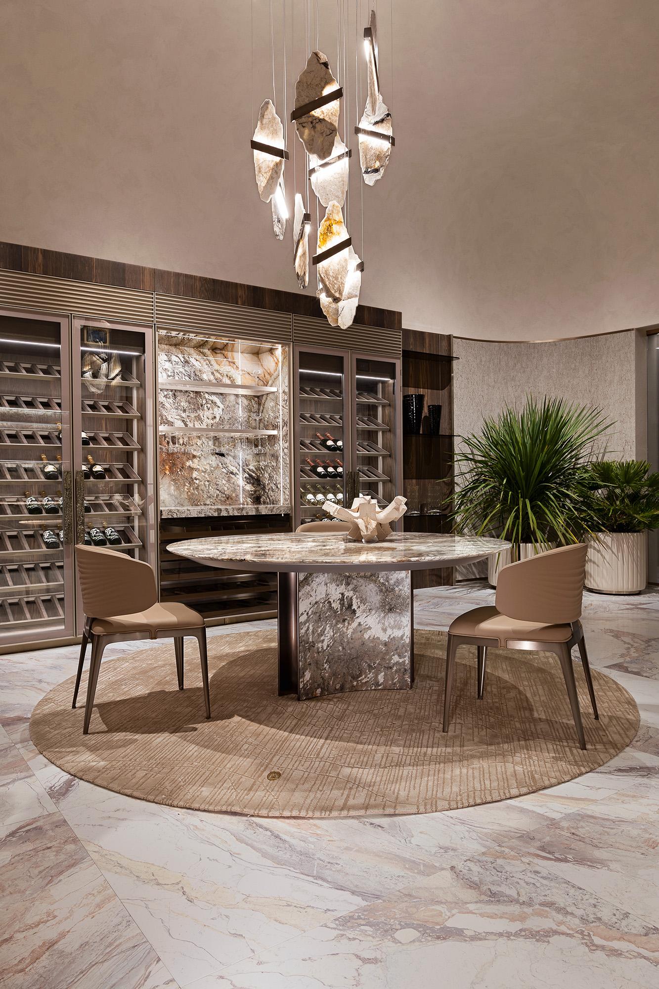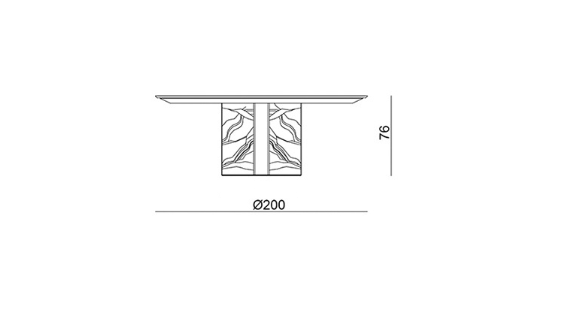 طاولة دائرية مصنوعة بالكامل من الرخام الإيطالي الطبيعي بنمط متداخل غني بالتفاصيل اللونية مع حواف مدوّرة بدقة عالية القاعدة أسطوانية الشكل مدعّمة بعناصر معدنية داخلية لتعزيز الثبات والمتانة تتكوّن من أربعة ألواح رخامية متقاطعة من الستانلس ستيل المقاوم لصدا بلون النحاس البني الذهبي