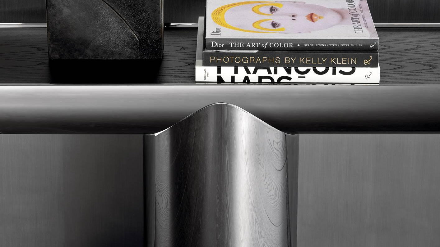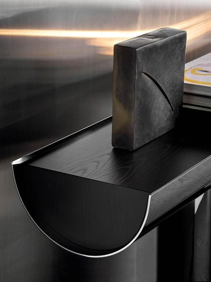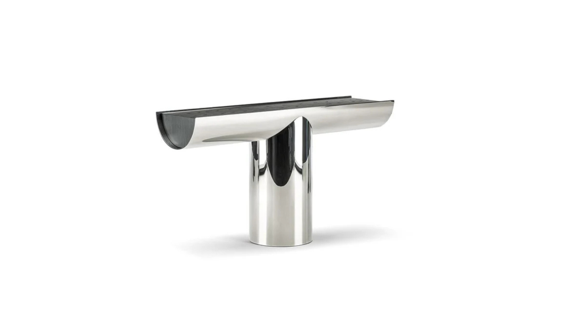 كونسول بتصميم إنسيابي بسطح من االخشب الطبيعي والقاعدة من الستانلس ستيل المقاوم للصدأ بتصميم انيق وعصري