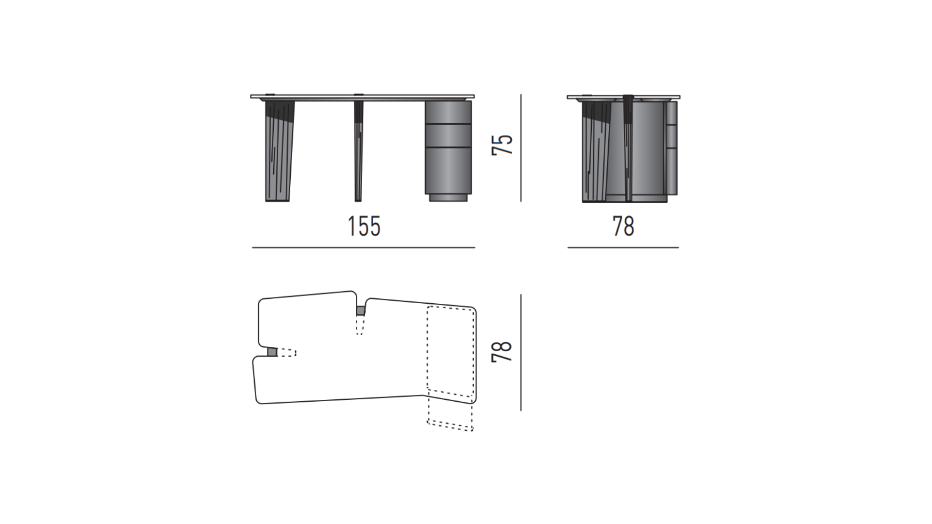 سطح بتصميم هندسي واسع من خشب البلوط الطبيعي بالون الاسود او بطلاء رمادي زيتي مدعوم بجانبين أحدهما بأرجل خشبية مستقيمة بلون أسود والآخر يحتوي على وحدة أدراج مدمجة بثلاث مستويات القاعدة مزودة بحواف من ستانلس ستيل المقاوم لصدا بلون التيتانيوم