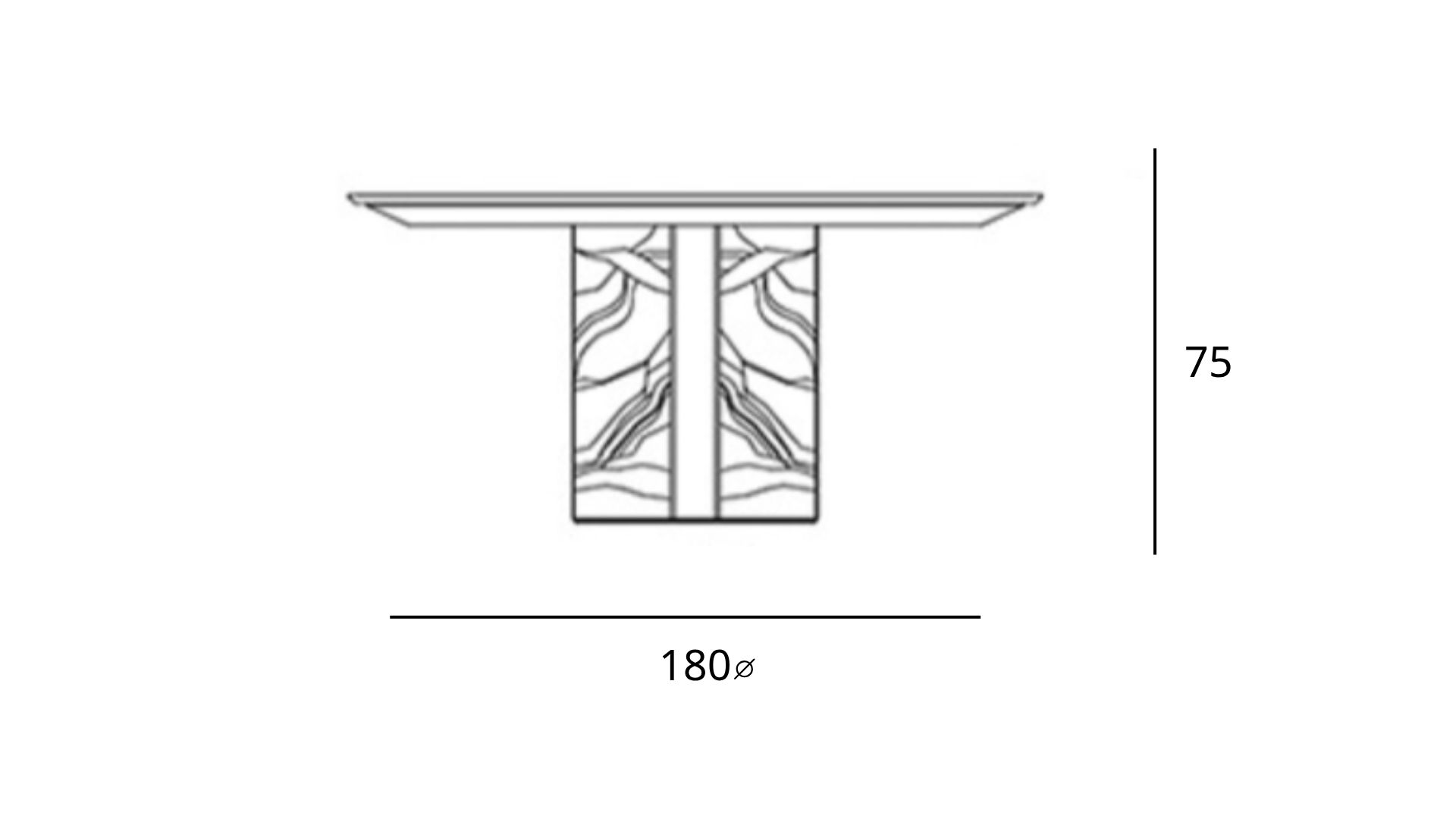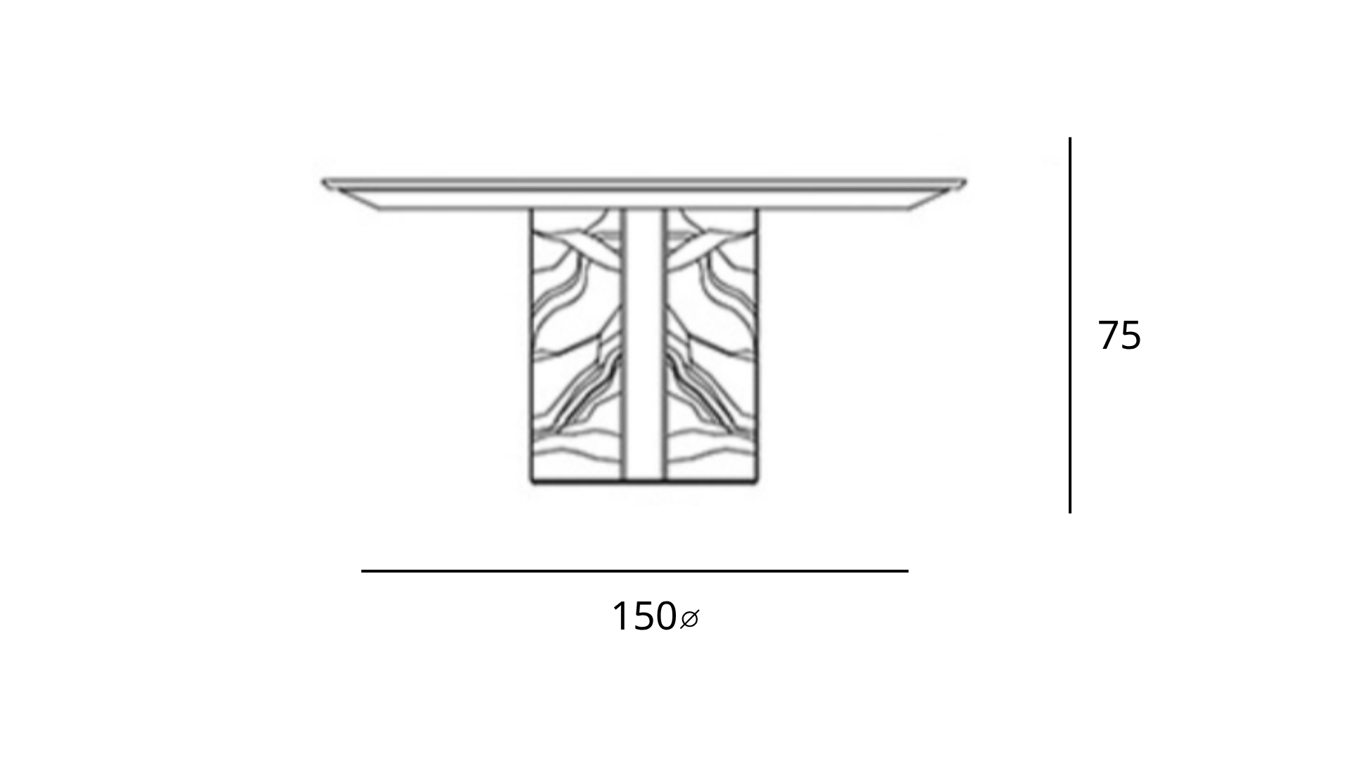 طاولة دائرية مصنوعة بالكامل من الرخام الإيطالي الطبيعي بنمط متداخل غني بالتفاصيل اللونية مع حواف مدوّرة بدقة عالية القاعدة أسطوانية الشكل مدعّمة بعناصر معدنية داخلية لتعزيز الثبات والمتانة تتكوّن من أربعة ألواح رخامية متقاطعة من الستانلس ستيل المقاوم لصدا بلون النحاس الذهبي