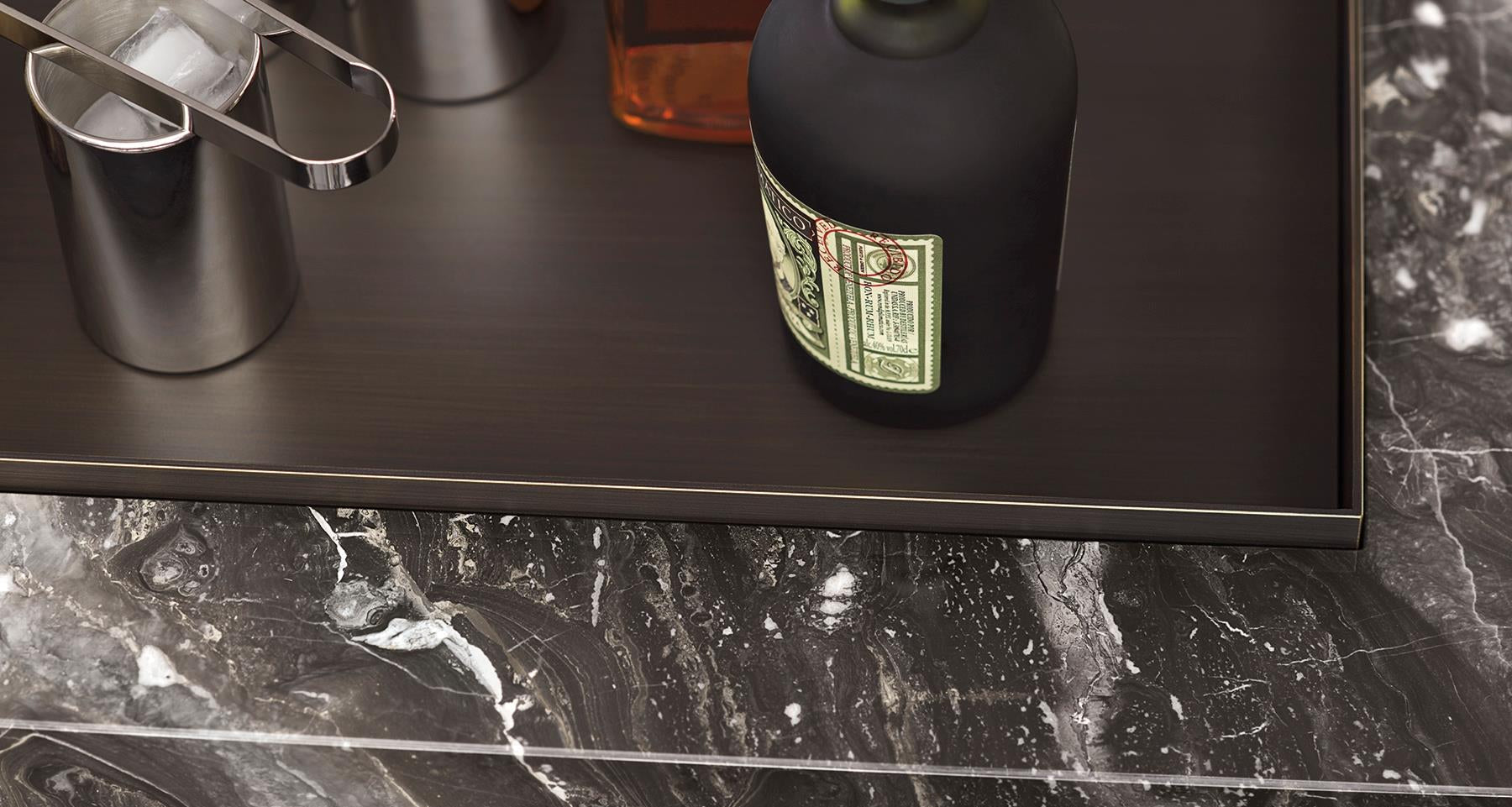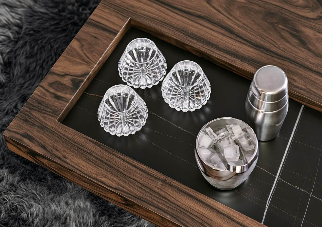 طاولة مربعة السطح مصنوع من الرخام الايطالي الطبيعي او الخشب الصلب الطبيعي بخيارات متعددة حسب اختيارك وتحتوي على صينية مثبتة القاعدة مصنوعة من الستانلس ستيل المقاوم لصدا مصممة بدقة مما يمنح الطاولة ثباتا ومتانة واناقة بلون نحاسي اسود مصقول بالذهبي