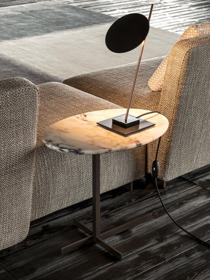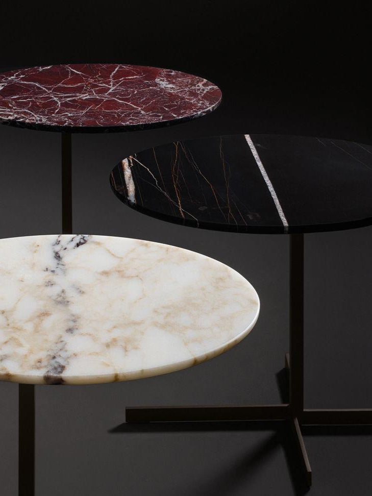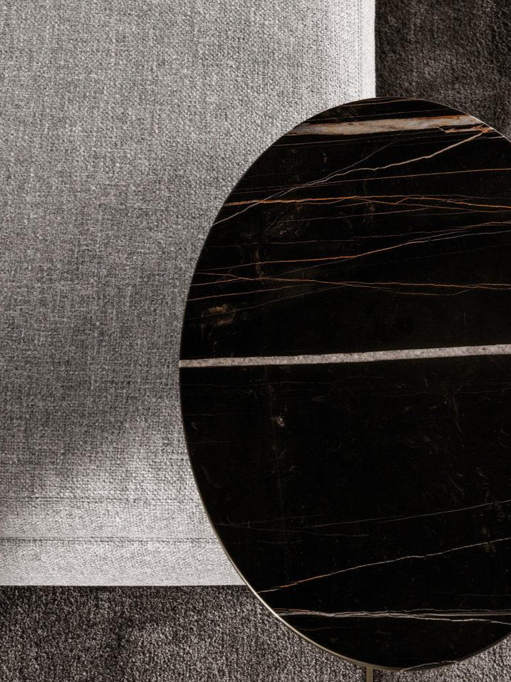 طاولة ذات سطح بيضاوي مصنوعة من رخام طبيعي إيطالي عالي الجودة مع خيارات متعددة من انواع الرخام حسب اختيارك الأرجل مصنوعة من الستانلس ستيل المقاوم لصدا بلون البرونزي المصقول القاعدة بتصميم متقاطع