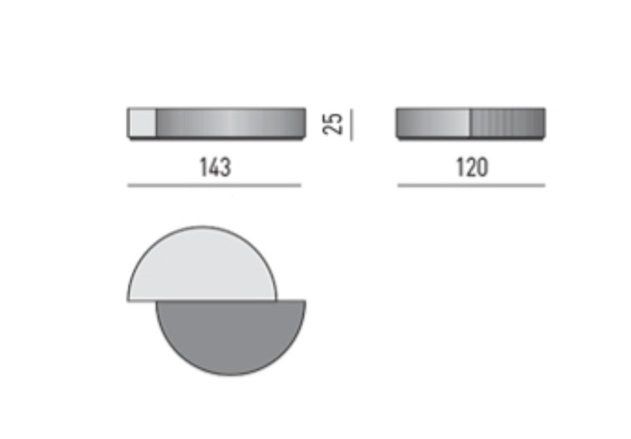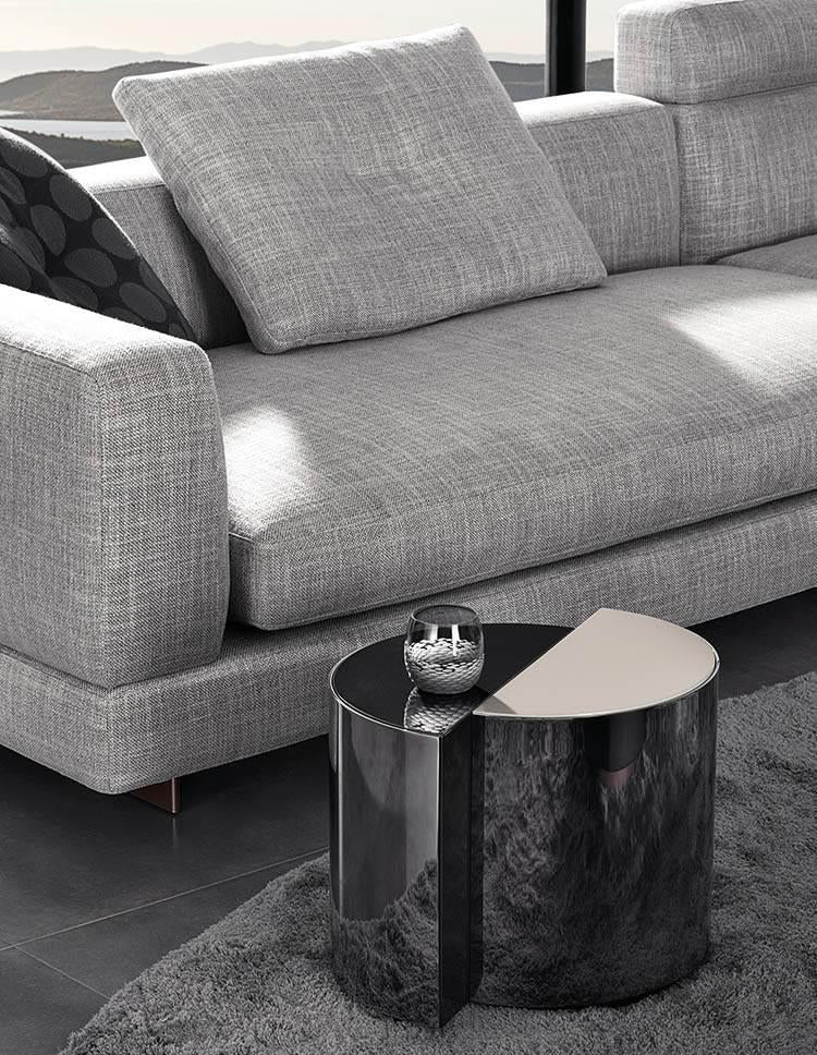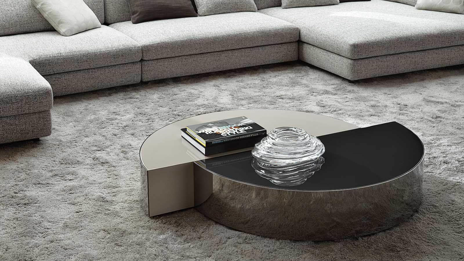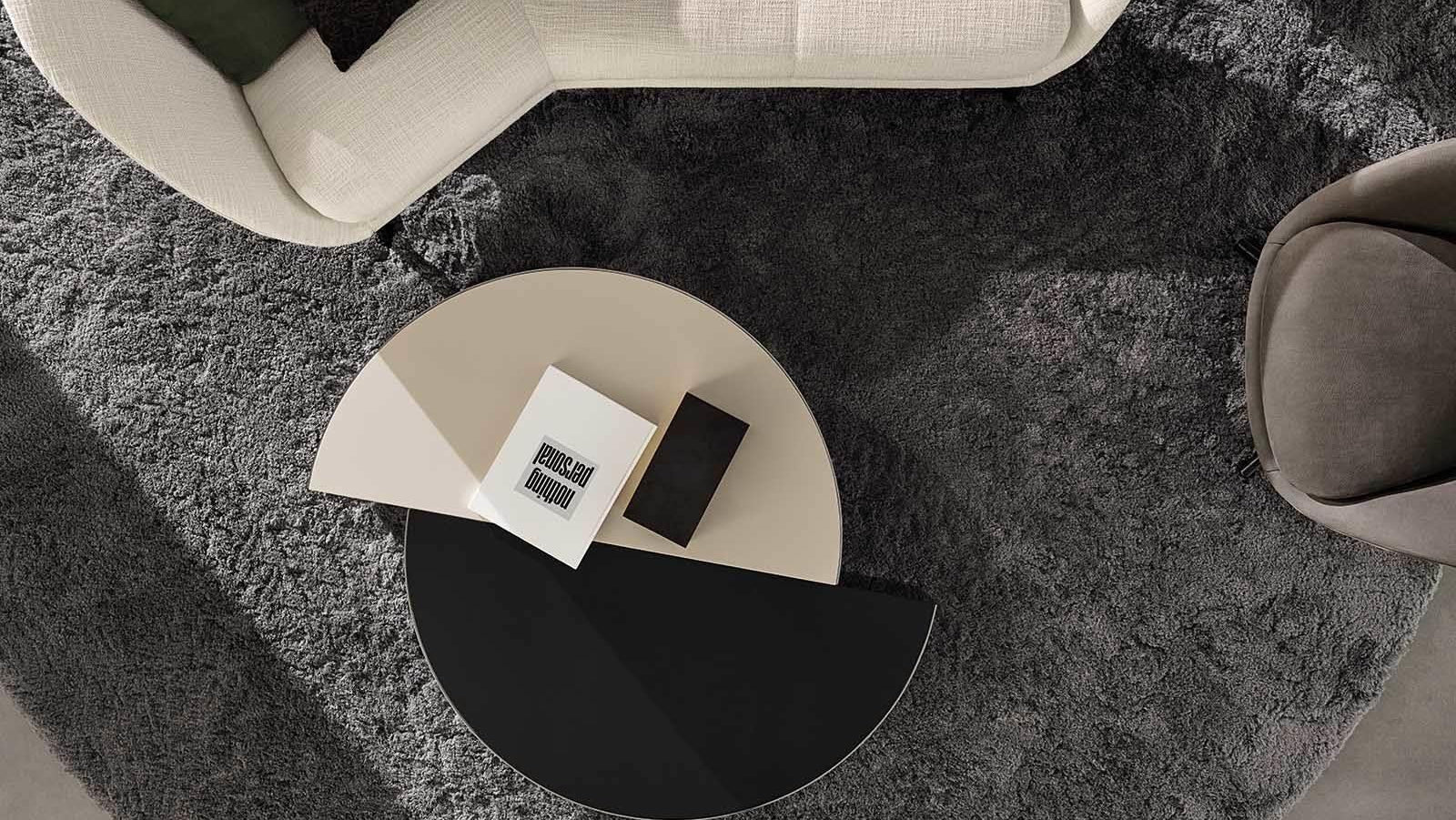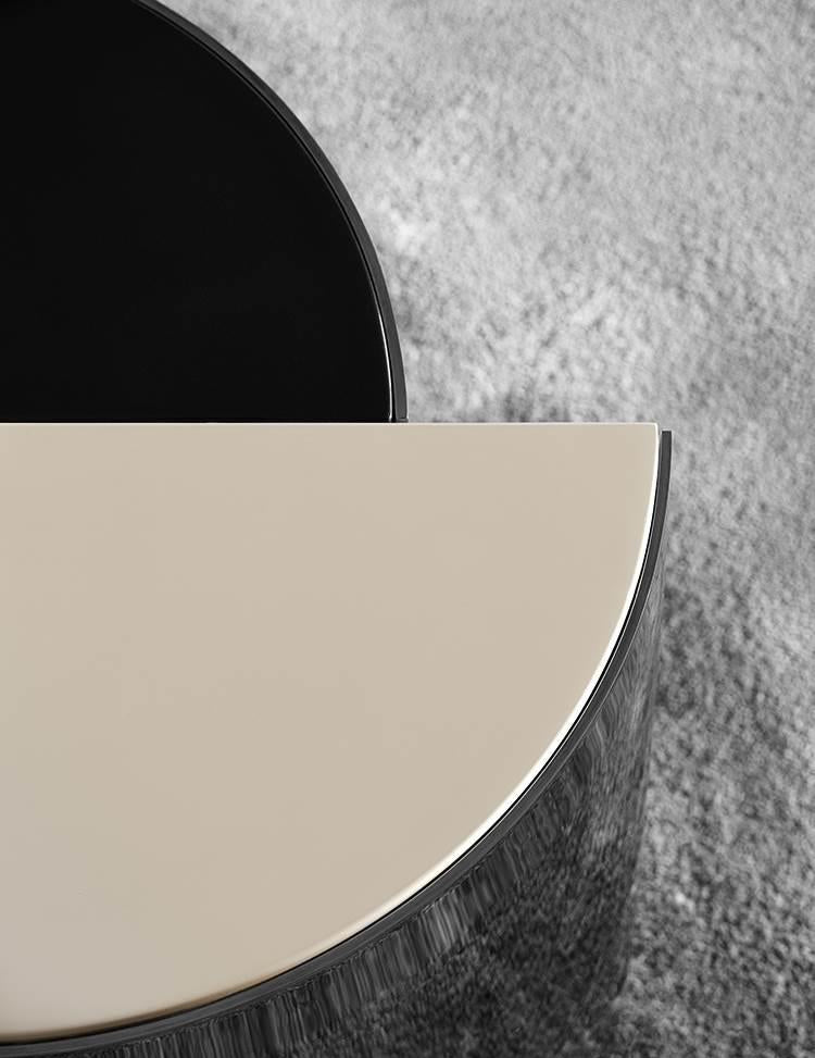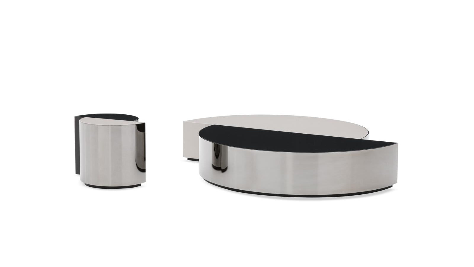 طاولة بشكل نصف دائري بقياسين مصنوعة من الستانلس ستيل المقاوم لصدا السطح بلونين ابيض واسود والقاعدة مصنوعة بشكل يمنح الطاولة ثبات و متانة بلون كروم عاكس
