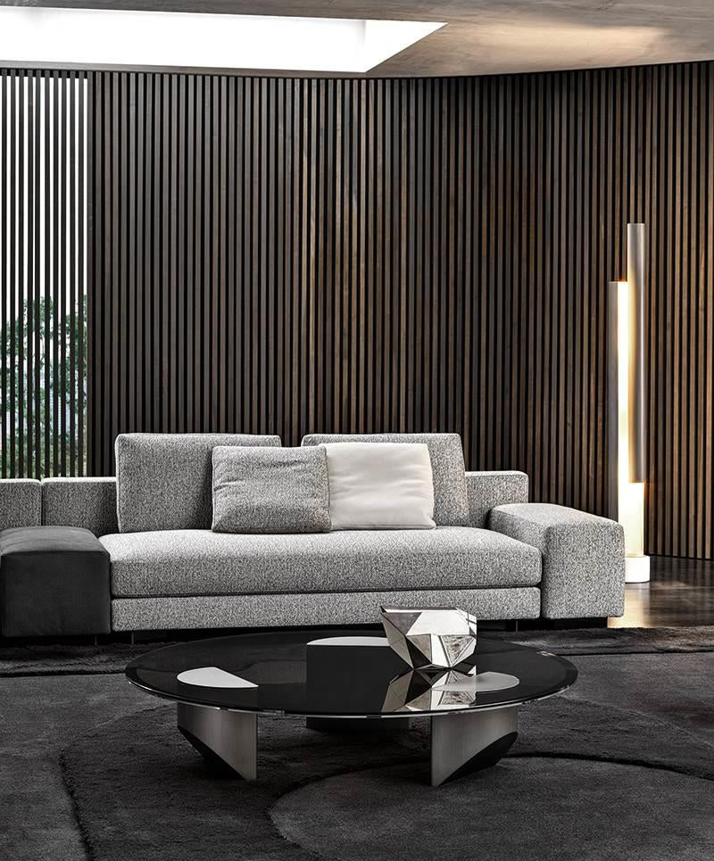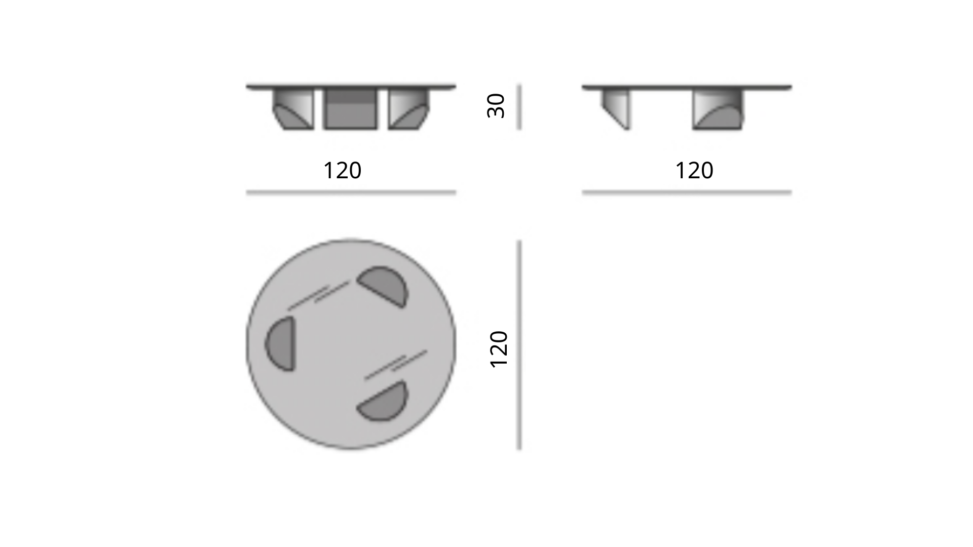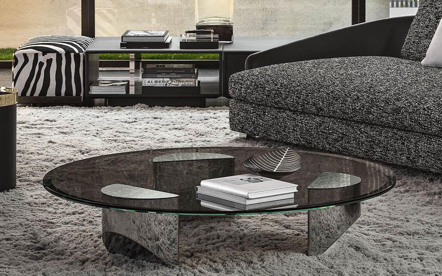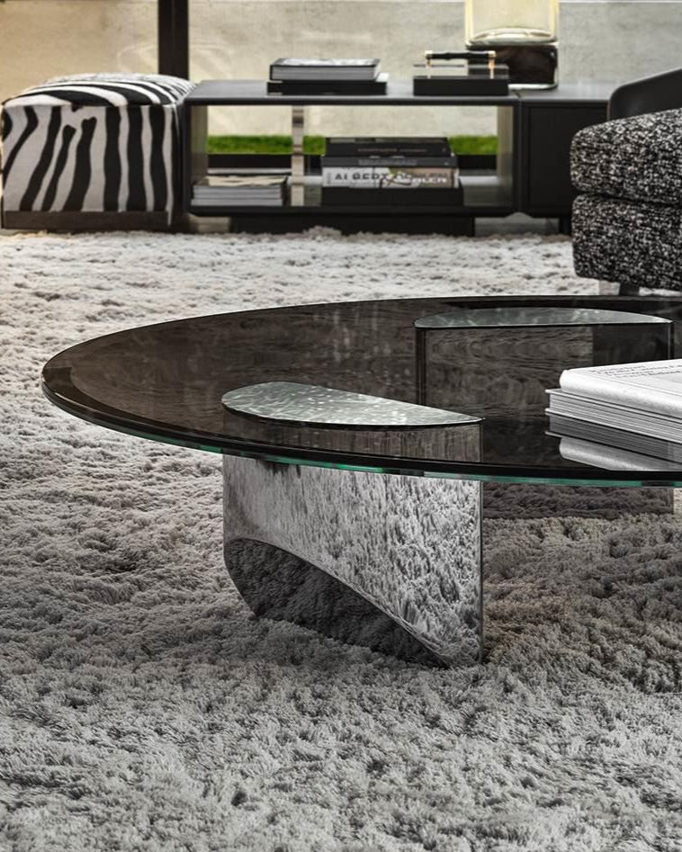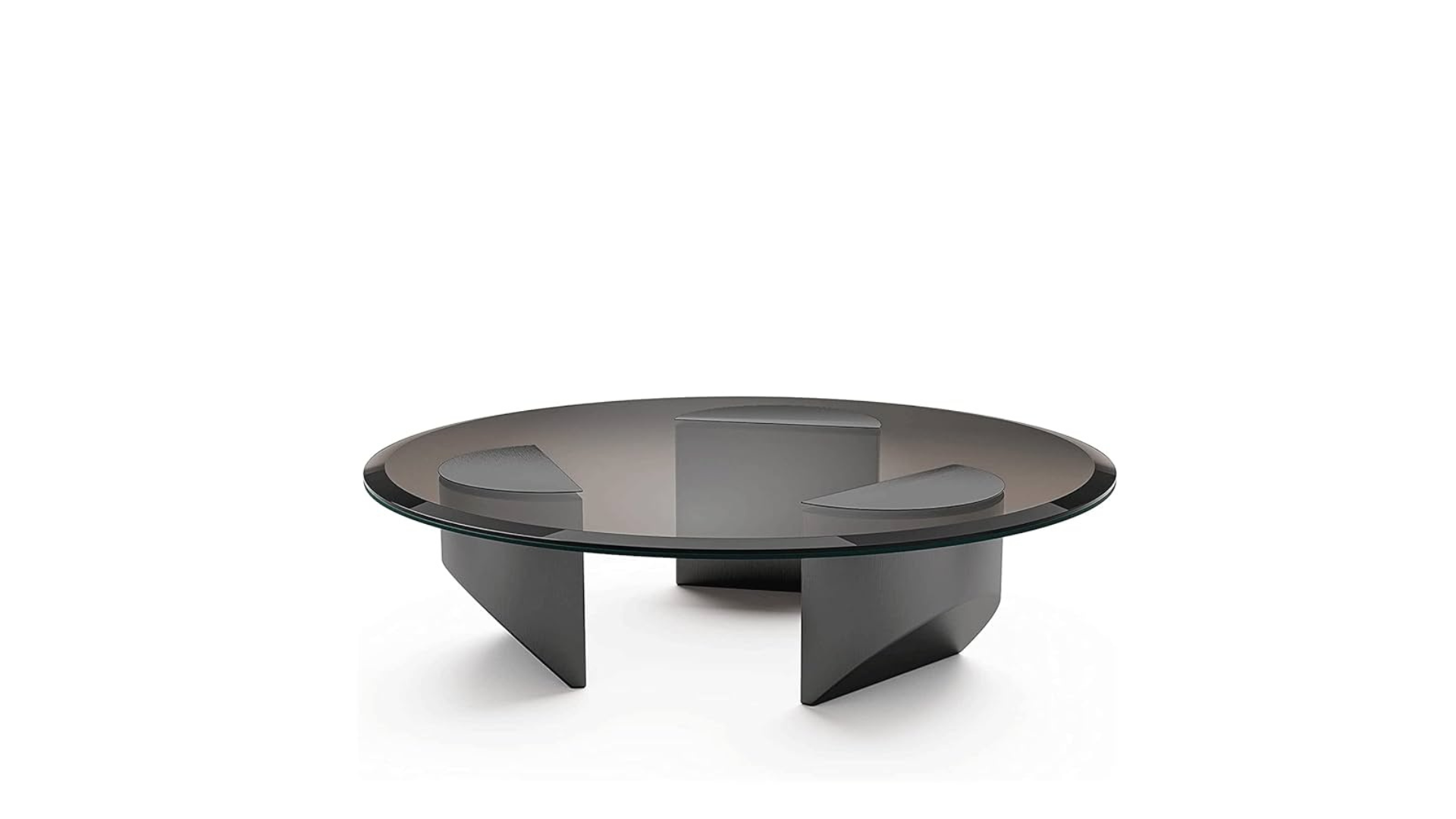 طاولة دائرية السطح مصنوع من زجاج رمادي شفاف القاعدة مكونة من ثلاث ارجل بشكل هندسي مصنوعة من استانلس ستيل المقاوم لصدا مصممة بدقة مما يمنح الطاولة ثباتا ومتانة واناقة بلون كروم