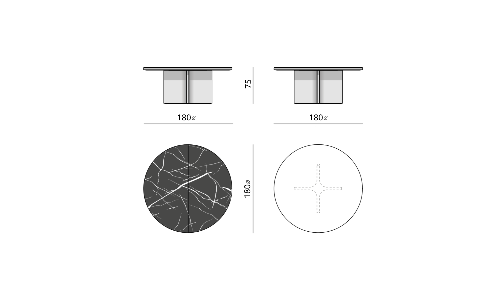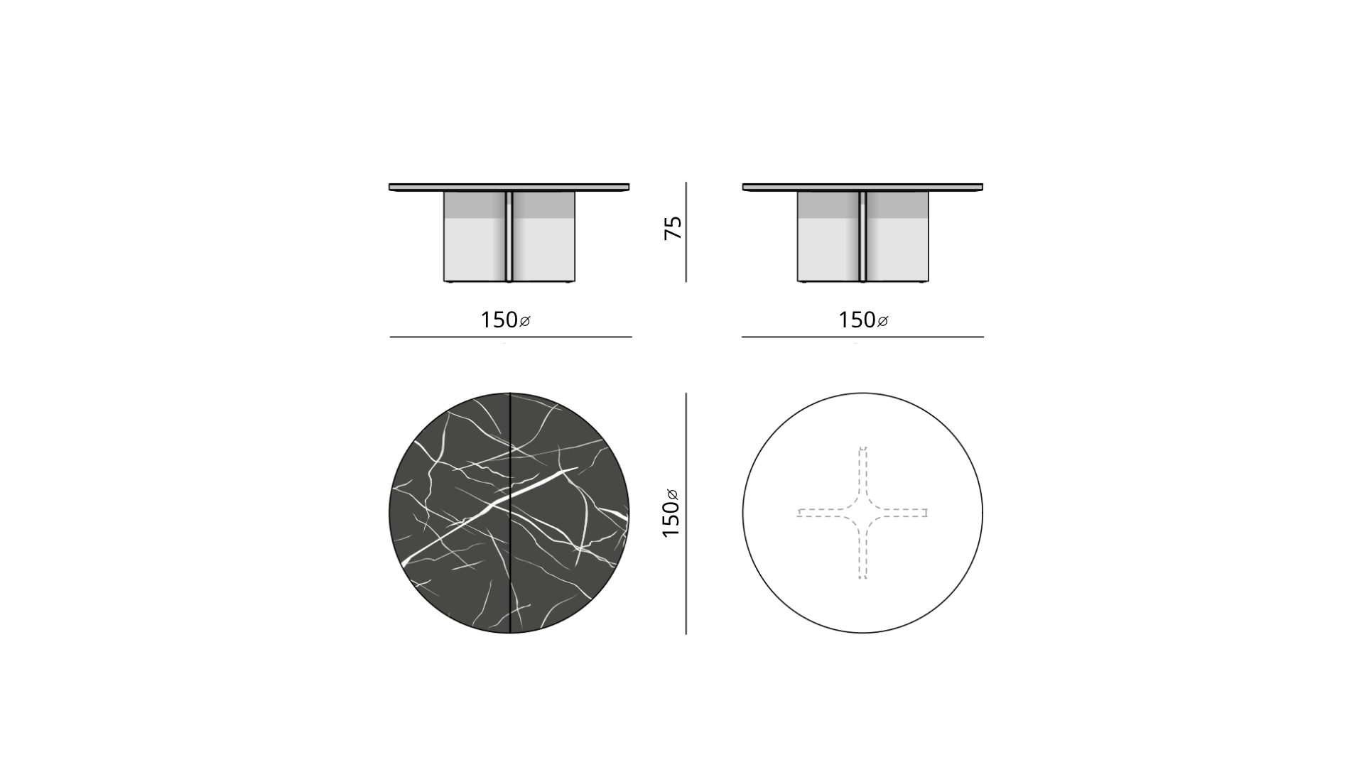 طاولة دائرية بتصميم عصري بسطح متساوي مصنوعة من رخام طبيعي إيطالي عالي الجودة مع خيارات متعددة من انواع الرخام حسب اختيارك القاعدة من أرجل معدنية متقاطعة توفر ثبات ودعم قوي من الستانلس ستيل المقاوم لصداء بلون التيتانيوم